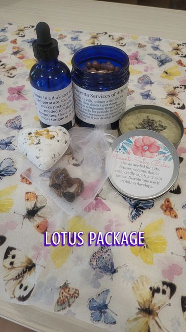 With this great package you get the placenta pills, a tincture, a 4oz salve balm for use on you or your baby, a healing postpartum bath bomb, and a cute umbilical cord keepsake!